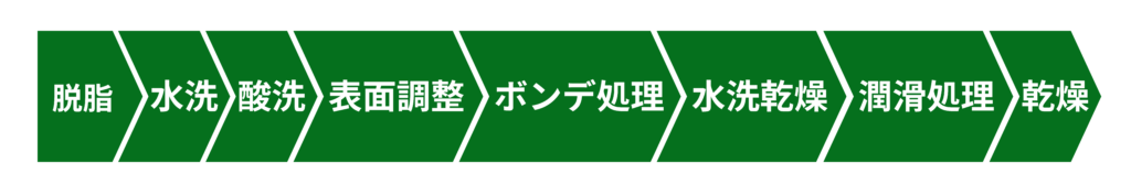 金属部品の潤滑性の向上を目的に行われる処理になります。潤滑性が向上することで、金属プレス加工の際の金型へのダメージ(摩耗・破損)を低減することができます。一般に以下の工程を経て、潤滑剤の被膜を形成します。